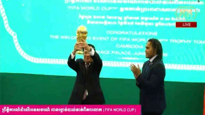ភ្នំពេញៈ ពានបាល់ទាត់ពិភពលោក (FIFA WORLD CUP) បានមកដល់ប្រទេសកម្ពុជាជាលើកដំបូងនៅថ្ងៃទី១៥ ខែមិថុនា ឆ្នាំ២០២២នេះហើយ។ សម្តេចតេជោ ហ៊ុន សែន នាយករដ្ឋមន្ត្រីកម្ពុជា បានអញ្ជើញទទួលពានបាល់ទាត់ពិភពលោកនេះដោយផ្ទាល់នៅវិមានសន្តិភាព។