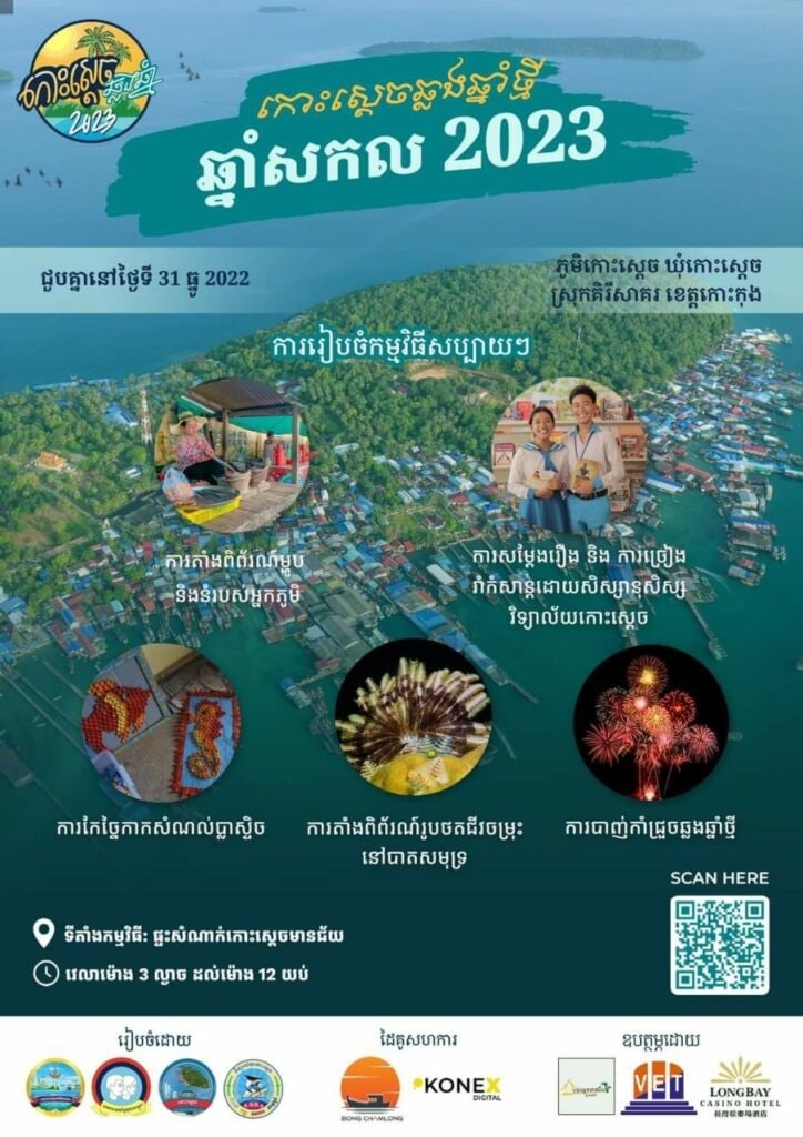 កោះកុងៈ កម្មវិធីកោះស្តេច ឆ្លងឆ្នាំថ្មី ឆ្នាំសកល២០២៣ រៀបចំដោយ រដ្ឋបាលស្រុកគិរីសាគរ នឹងប្រព្រឹត្តទៅនៅថ្ងៃទី៣១ ខែធ្នូ ឆ្នាំ២០២២ ចាប់ពីវេលាម៉ោង ៣.០០នាទីរសៀល ដល់ម៉ោង ១២.០០យប់ ឆ្លងចូលឆ្នាំថ្មី២០២៣។