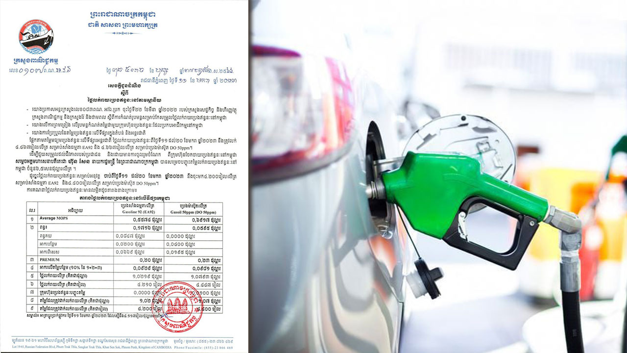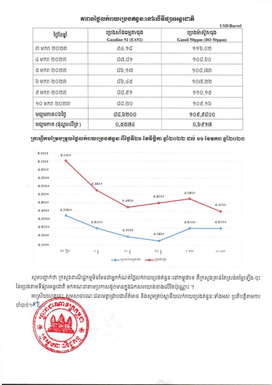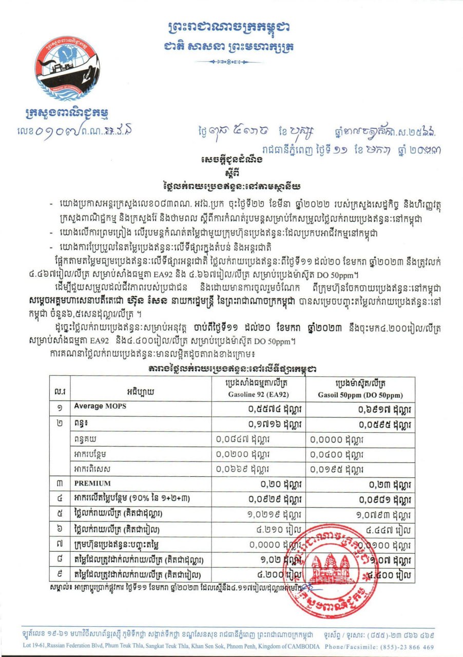 យោងតាមសេចក្តីជូនដំណឹងរបស់ក្រសួងពាណិជ្ជកម្ម ចេញផ្សាយនៅថ្ងៃទី១ ខែធ្នូនេះ បានឱ្យដឹងថា សម្រាប់ការអនុវត្តចាប់ពីថ្ងៃទី១០ ដល់ថ្ងៃទី២០ ខែមករា ឆ្នាំ២០២៣នេះ តម្លៃប្រេងសាំងនៅក្នុងប្រទេសកម្ពុជានឹងត្រូវលក់នៅក្នុងតម្លៃ៤.២០០រៀល ចំណែកប្រេងម៉ាស៊ូតនឹងត្រូវលក់ក្នុងតម្លៃ៤.៤០០រៀល។