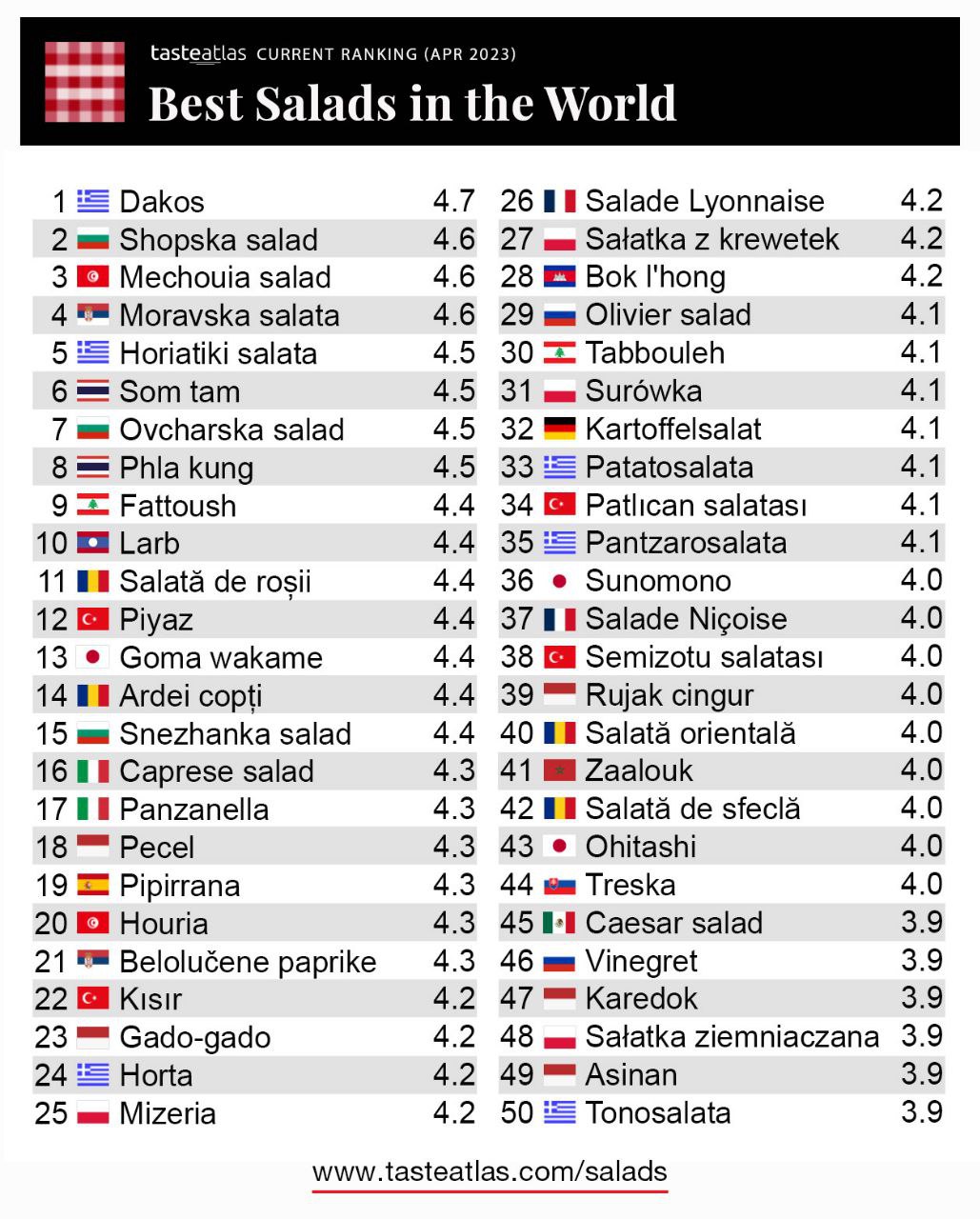 បុកល្ហុងខ្មែរ ជាប់ចំណាត់ថ្នាក់ទី២៨ ជាមួយនឹងពិន្ទុ៤,២ ក្នុងចំណោមមុខម្ហូបសាឡាដចំនួន៥០មុខដ៏ល្អបំផុតនៅក្នុងពិភពលោក។