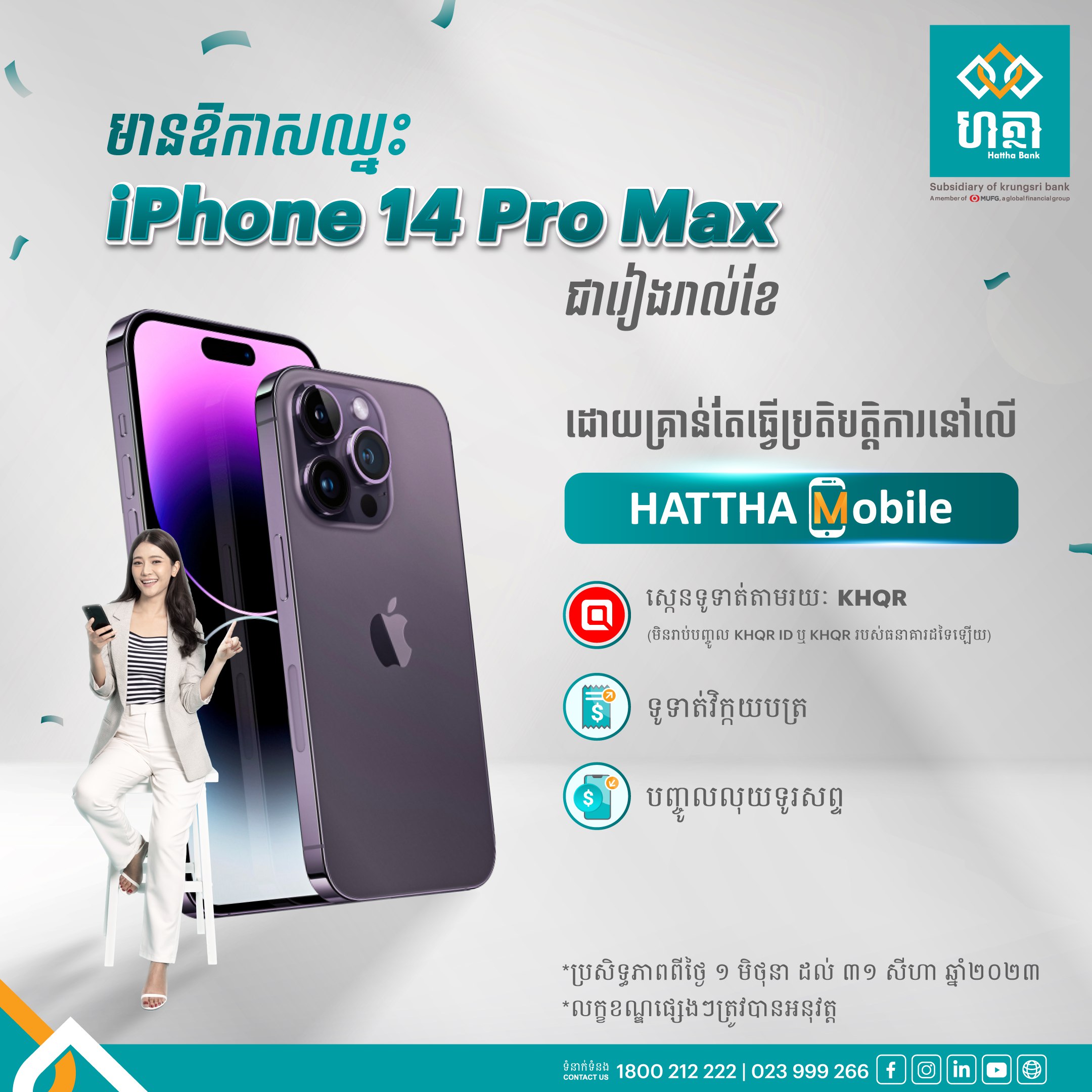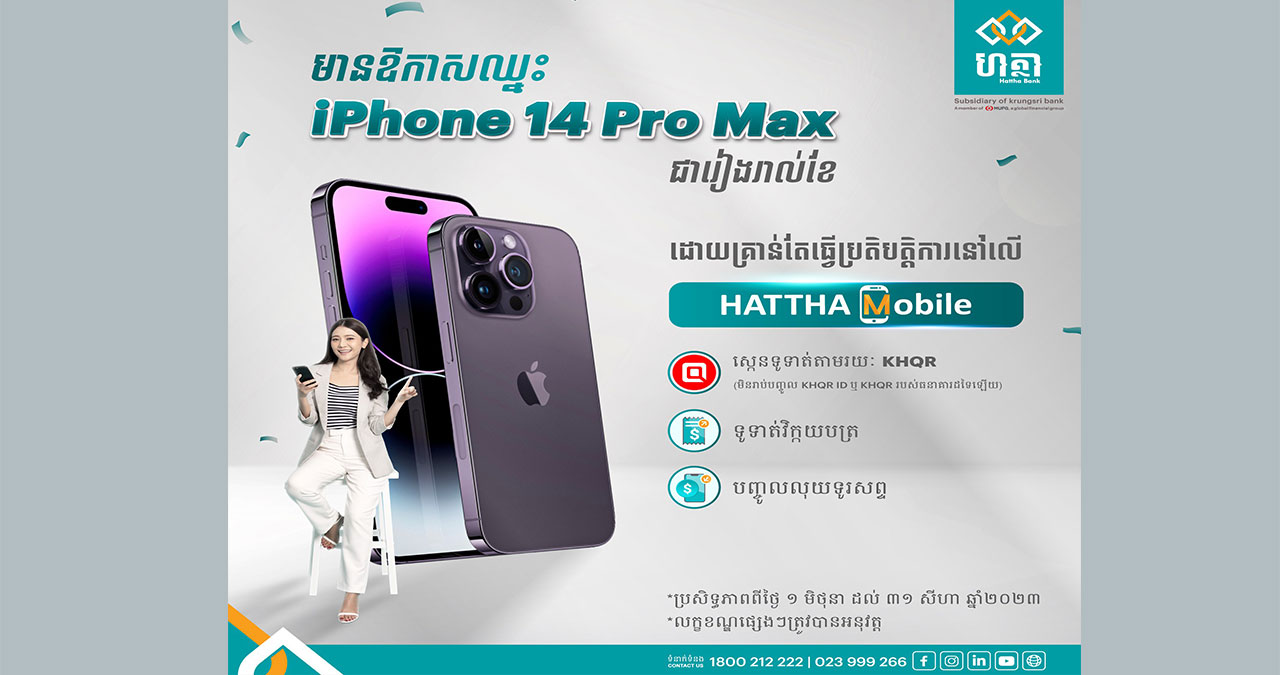 ភ្នំពេញ, ថ្ងៃទី០១ ខែមិថុនា ឆ្នាំ២០២៣៖ ធនាគារ ហត្ថា ដែលជាធនាគារពាណិជ្ជឈានមុខគេមួយរបស់ព្រះរាជាណាចក្រកម្ពុជា បានរៀបចំកម្មវិធីចាប់ឆ្នោតផ្សងសំណាង ដោយផ្ដល់ជូនទូរសព្ទ iPhone 14 Pro Max មួយរង្វាន់ជារៀងរាល់ខែ សម្រាប់អតិថិជនដែលធ្វើប្រតិបត្តិការតាមកម្មវិធី Hattha Mobile។ កម្មវិធីផ្ដល់ជូនពិសេសនេះប្រព្រឹត្តទៅរយៈពេល៣ខែ ចាប់ពីថ្ងៃទី០១ ខែមិថុនា ឆ្នាំ២០២៣ រហូតដល់ថ្ងៃទី៣១ ខែសីហា ឆ្នាំ២០២៣។