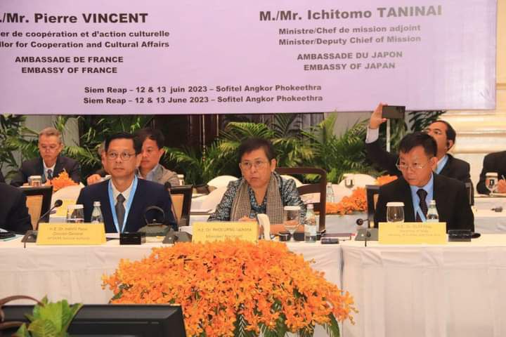 លោកស្រីបណ្ឌិតភឿង សកុណា រដ្ឋមន្ត្រីក្រសួងវប្បធម៌ និងវិចិត្រសិល្បៈ និងជាប្រធានក្រុមប្រឹក្សាភិបាល អាជ្ញាធរជាតិអប្សរា លោក Tani-nai Ichitomo អនុប្រធានបេសកកម្មនៃស្ថានទូតជប៉ុនប្រចាំកម្ពុជា លោក Pierre Vincent ទីប្រឹក្សាកិច្ចសហប្រតិបត្តិការវប្បធម៌ស្ថានទូតបារាំងប្រចាំកម្ពុជា និងលោក Sardar Umar Alam តំណាងអង្គការយូណេស្កូប្រចាំកម្ពុជា។