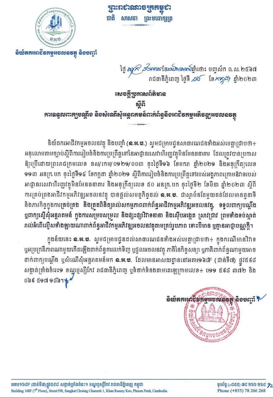 សេចក្តីប្រកាសបានបន្តថា ក្នុងន័យនេះ ន.អ.ប. សូមជម្រាបជូនដល់សាធារណជនទាំងអស់មេត្តាជ្រាបថា ក្នុងករណីមានវិវាទ ឬអប្រក្រតីភាពណាមួយ កើតឡើងពាក់ព័ន្ធការលក់ទិញ ឬជួលអចលនវត្ថុ ភាគីនៃកិច្ចសន្យា ឬភាគីពាក់ព័ន្ធណាមួយអាច ដាក់ពាក្យបណ្ដឹង ឬសំណើសុំអន្តរាគមន៍មក ន.អ.ប. ដែលមានអាសយដ្ឋាននៅអគារ១៦៨F (ជាន់ទី៧) ផ្លូវ៥៩៨ សង្កាត់ច្រាំងចំនេះ១ ខណ្ឌប្ញស្សីកែវ រាជធានីភ្នំពេញ ឬទំនាក់ទំនងតាមតេឡេក្រាមលេខ ០១១ ៥៩៨ ៣៧២ និង ៧១៨៦។២ ០៦៩ ៥១៧ ១៨៦។