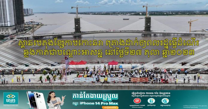 ភ្នំពេញ៖ ស្ពានបេតុងខ្សែកាបកោះនរា ឆ្លងពីទីក្រុងកោះពេជ្រ ទៅទីក្រុងកោះនរា ស្ថិតក្នុង ខណ្ឌច្បារអំពៅ និងខណ្ឌចំការមន គ្រោងនិងដាក់ឲ្យប្រជាពលរដ្ឋបានធ្វើដំណើរឆ្លងកាត់ជាបណ្ដោះអាសន្ននៅថ្ងៃទី ២៧តុលាឆ្នាំ២០២៣ខាងមុខនេះ ។
