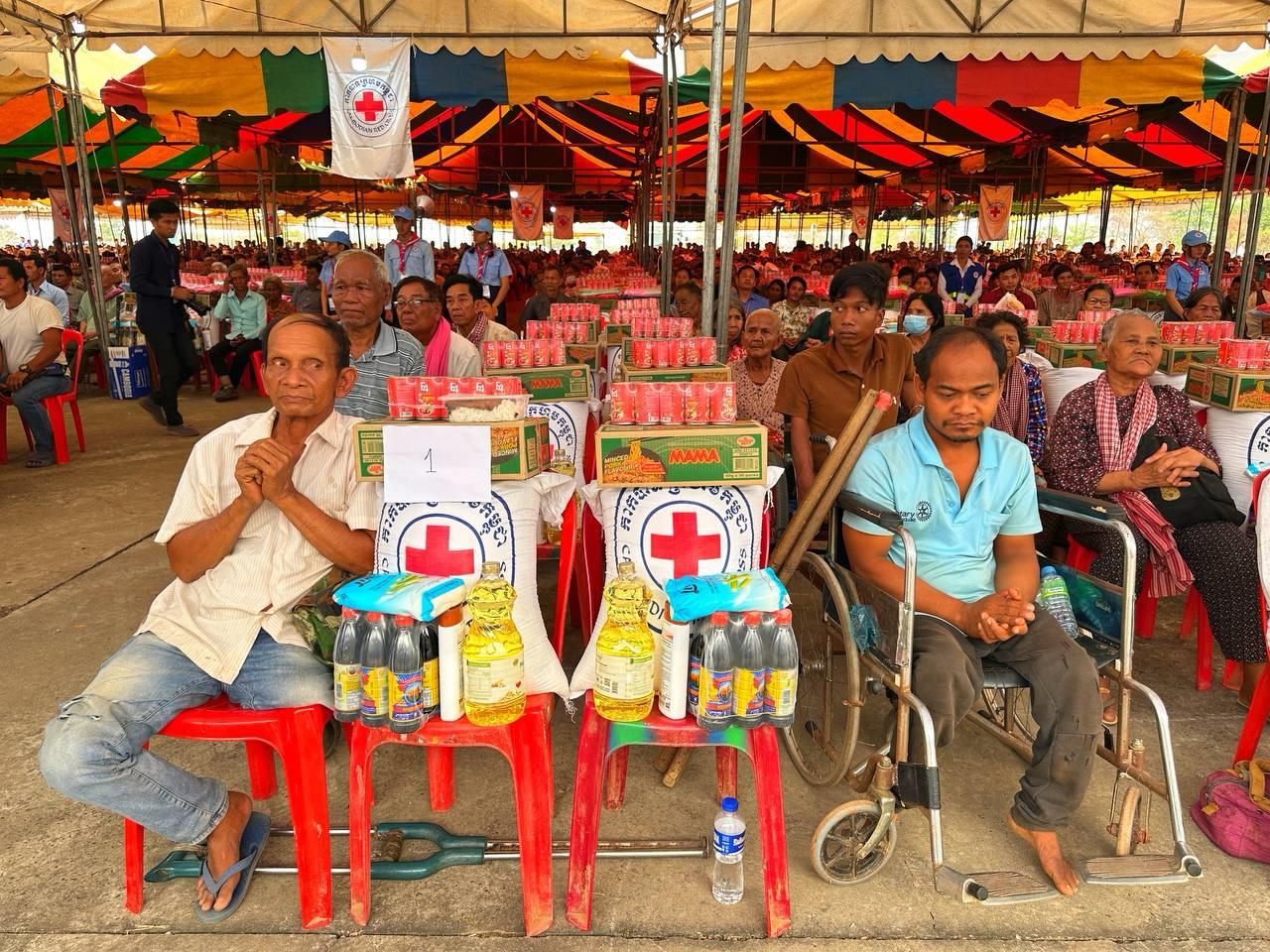 ស្បៀង សម្ភារៈថវិកាខាងលើនេះ ជាអំណោយរបស់សប្បុរសជន តាមរយៈកាកបាទក្រហមកម្ពុជា ក្នុងនោះ លោកអ្នកឧកញ៉ា ភាព ហៀក បានឧបត្ថម្ភ ប្រេងឆា ៥ពាន់ដប, លោកអ្នកឧកញ៉ា ភូ ហុងសួន ស៊ីគង់ទ្រីវ បានឧបត្ថម្ភ មី ៥ពាន់កេស, អ្នកឧកញ៉ា វិញ ហ៊ួរ និងលោកជំទាវ ឆេង សៀង វិញហ៊ួរ តំណាងក្រុមហ៊ុនវិនិយោគរោងចក្រផលិតអគ្គិសនី និងរ៉ែធ្យូងថ្មនៅខេត្តឧត្តរមានជ័យ ឧបត្ថម្ភ អង្ករចំនួន ៥០តោន, លោកជំទាវឧកញ៉ា លីម ស្រីពៅ ឧបត្ថម្ភ ស្ករស ៥តោន, ឧកញ៉ា ជឹង ធានសេង និងលោកជំទាវ តាន់ សឺយមួយ ឧបត្ថម្ភ សាប៊ូកក់សក់ (ក្លិន) ចំនួន ៥ពាន់ដប, អ្នកឧកញ៉ា អ៊ឹង ស៊ីស្រ៊ន ឧបត្ថម្ភថវិកា ១០លានរៀល, លោកជំទាវ ភេ ដាលីន អ៊ុតឈន ឧបត្ថម្ភថវិកា ៥លានរៀល, អ្នកឧកញ៉ា ឈុន អូន និងលោកជំទាវ ឧបត្ថម្ភថវិកា ៤០០លានរៀល, ឧកញ៉ា លឹម ហេង និងលោកជំទាវ ឧបត្ថម្ភថវិកា ២ម៉ឺនដុល្លារ។