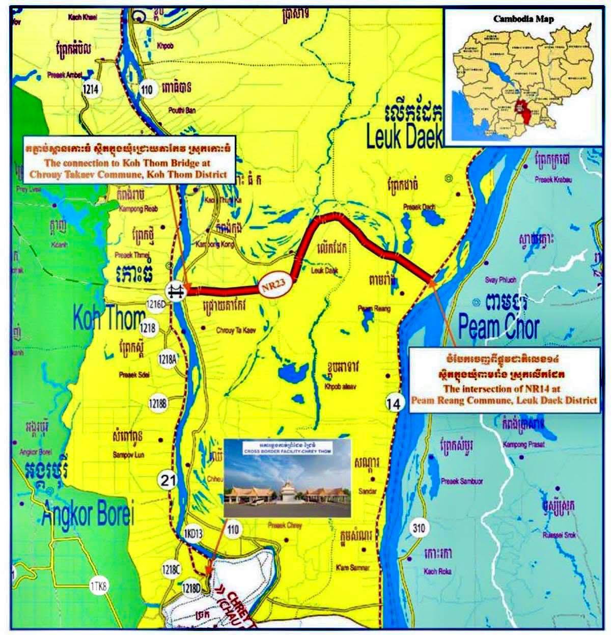 ភ្នំពេញៈ កំណាត់ផ្លូវជាតិលេខ២៣(NR23) ប្រវែង១៩,៨គីឡូម៉ែត្រ មានទទឹងតួផ្លូវ១១ម៉ែត្រ ចាប់ពីគល់ស្ពានកោះធំត្រើយខាងកើត ស្ថិតក្នុងឃុំជ្រោយតាកែវ ស្រុកកោះធំ (PK0+000) ដល់ផ្លូវជាតិលេខ១៤ ឃុំពាមរាំង ស្រុកលើកដែក ខេត្តកណ្តាល (PK19+800)។