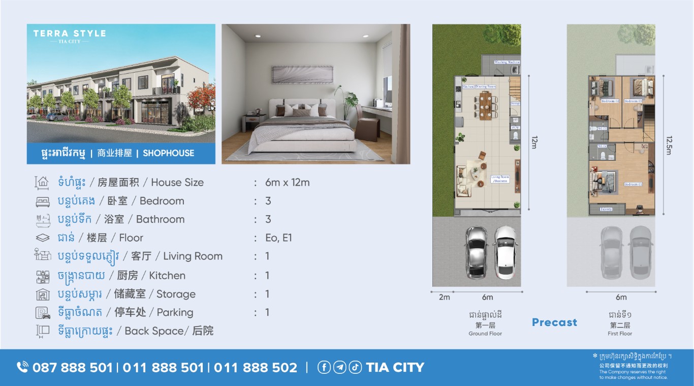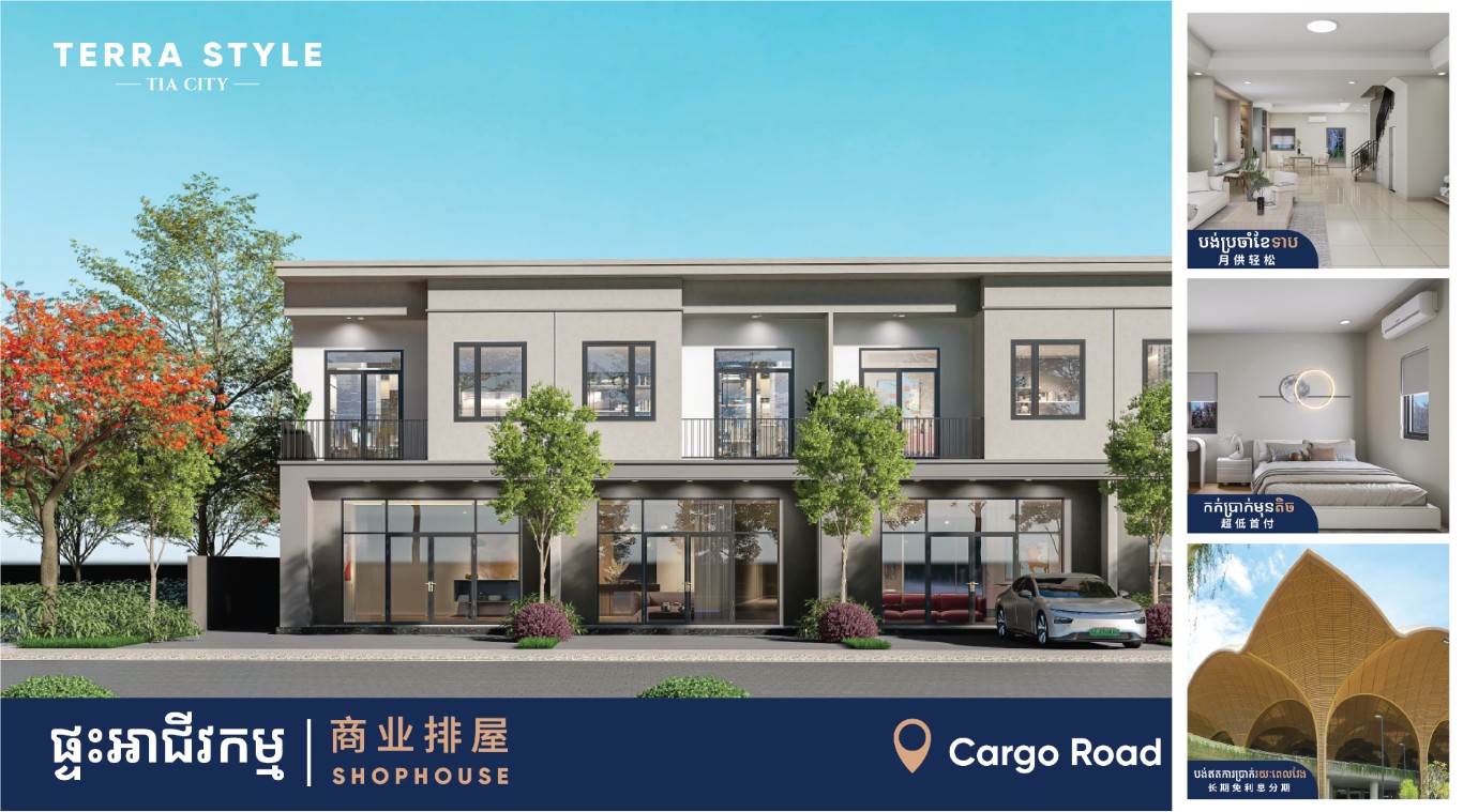 ឱកាសល្អ! ទីតាំងល្អ! ទីតាំងដែលមានកំណើនចរាចរណ៍មមាញឹកលើផ្លូវបេតុង Cargo Road សម្រាប់ ផ្ទះអាជីវកម្ម (Shophouse) នៃគម្រោង TERRA STYLE បានដាក់លក់គម្រោងផ្ទះថ្មី ក្នុងតម្លៃក្រោម10ម៉ឺនដុល្លារ ដែលស្ថិតលើបណ្តោយផ្លូវបេតុង Cargo Road ជុំវិញព្រលានយន្តហោះអន្តរជាតិតេជោ។ ផ្ទះមានទំហំធំទូលាយងាយស្រួលរស់នៅ និងសាកសមសម្រាប់ប្រកបអាជីវកម្ម មានទំហំធំរហូតដល់៖ ទទឹង ៦ ម៉ែត្រ x បណ្តោយ ១២ ម៉ែត្រ មានចំណតរថយន្តធំ និងធ្លាក្រោយផ្ទះធំទូលាយ និងមានប្រឡាយទឹកស្អាតក្រោយផ្ទះផងដែរ។