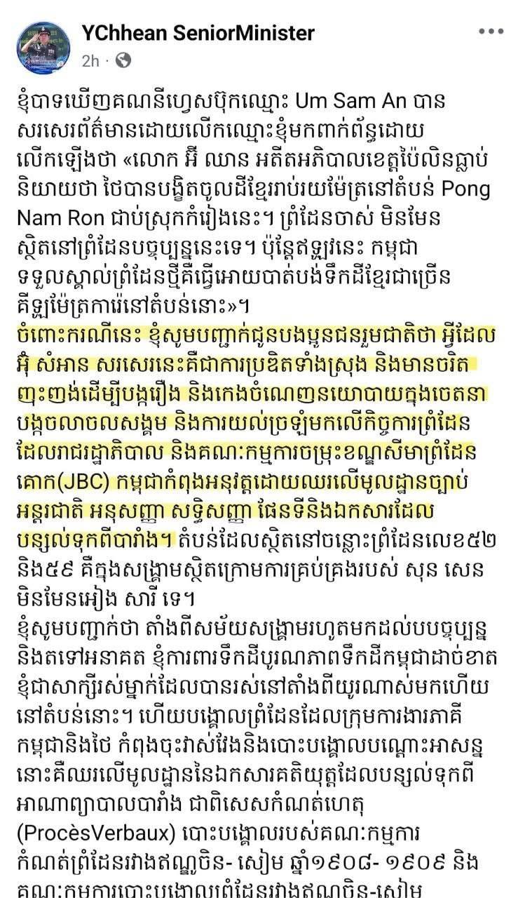 ក្នុងកាលៈទេសៈដែលយើងកំពុងដោះស្រាយបញ្ហាព្រំដែនជាមួយប្រទេសជិតខាង ខ្ញុំមិនចង់មានការឆ្លើយឆ្លងជាមួយអ្នកនយោបាយខ្មែរមួយចំនួននោះទេ។ ក៏ប៉ុន្តែពេលខ្លះក៏មានការចាំបាច់ក្នុងការលើកឡើងនូវចំណុចមួយចំនួន កុំឱ្យក្រុមអ្នកនយោបាយខ្លះឆ្លៀតប្រឌិតរឿងមិនពិតក្នុងចេតនាកេងចំណេញនយោបាយ និងដើម្បីឱ្យប្រជាពលរដ្ឋមានការយល់ច្រឡំមកលើរាជរដ្ឋាភិបាល។