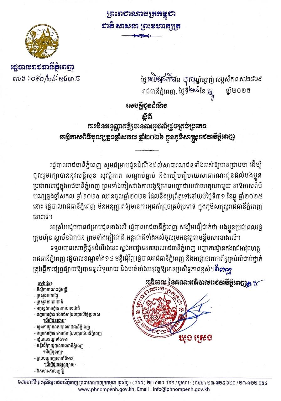 (ភ្នំពេញ)៖ រដ្ឋបាលរាជធានីភ្នំពេញ នឹងមិនអនុញ្ញាតឱ្យប្រជាពលរដ្ឋ អុជកាំជ្រួចគ្រប់ប្រភេទ ក្នុងភូមិសាស្រ្តរាជធានីភ្នំពេញ នាឱកាសពិធីបុណ្យឆ្លងឆ្នាំសកល ឆ្នាំ២០២៥ ឈានចូលឆ្នាំ២០២៦ ដែលនឹងប្រព្រឹត្តទៅនៅយប់ថ្ងៃទី៣១ ខែធ្នូ ឆ្នាំ២០២៥នោះឡើយ។