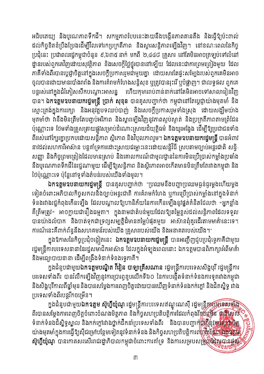 ឧបនាយករដ្ឋមន្ត្រី ប្រាក់ សុខុន បានសម្តែងនូវអំណរគុណយ៉ាងជ្រាលជ្រៅរបស់កម្ពុជាចំពោះប្រទេសម៉ាឡេស៊ី ក្នុងនាមជាប្រធានអាស៊ានឆ្នាំ២០២៥ សម្រាប់ការសម្របសម្រួលបទឈប់បាញ់ និងគាំទ្រដល់កិច្ចខិតខំប្រឹងប្រែងនានាឆ្ពោះទៅរកដំណោះស្រាយដោយសន្តិវិធី។