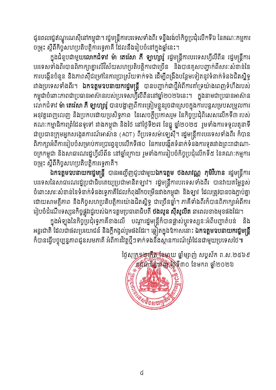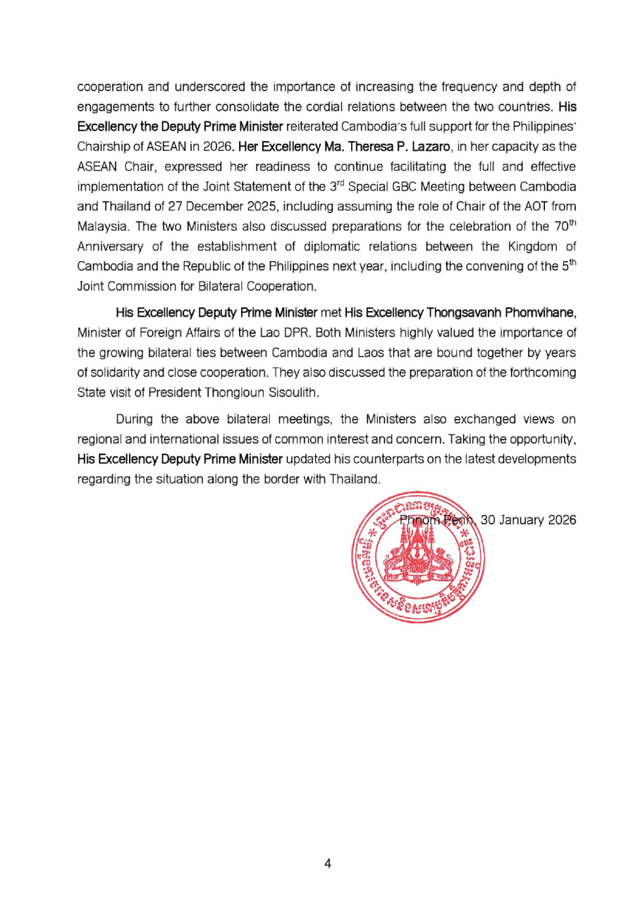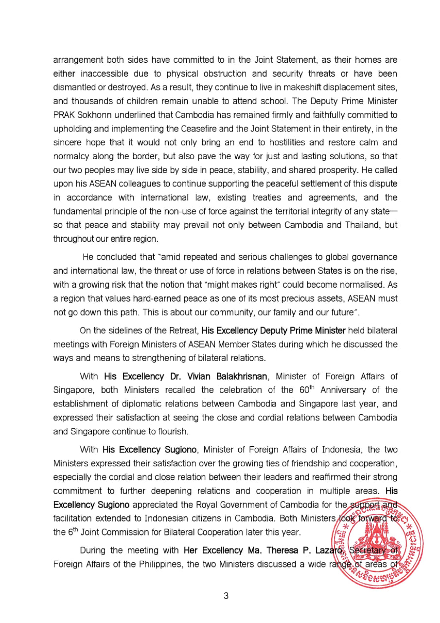 លោករដ្ឋមន្ត្រីបានបន្ថែមទៀតថា ភាគីទាំងពីរបានឯកភាពគ្នាថា រាល់ការរៀបចំទាំងអស់ក្រោមសេចក្តីប្រកាសរួម នៃកិច្ចប្រជុំ ពិសេសលើកទី៣ របស់គណៈកម្មាធិការព្រំដែនទូទៅ គឺមិនប៉ះពាល់ដល់ការបោះបង្គោលខណ្ឌសីមាព្រំដែន និងព្រំដែនអន្តរជាតិរវាងប្រទេសទាំងពីរឡើយ។ ប្រទេសទាំងពីរ បានសង្កត់ធ្ងន់បន្ថែមទៀតអំពីសារៈសំខាន់ ដ៏ចាំបាច់នៃការពង្រឹងបទឈប់បាញ់លើកទី២ នៅថ្ងៃទី២៧ ខែធ្នូ ឆ្នាំ២០២៥ និងការធានាសន្តិភាព សន្តិសុខ និងស្ថិរភាពយូរអង្វែងនៅតាមព្រំដែន តាមរយៈទំនាក់ទំនងបើកចំហនិងដោយផ្ទាល់ ការជឿទុកចិត្តគ្នាទៅវិញទៅមក វិធានការកសាងទំនុកចិត្ត និងកិច្ចខិតខំប្រឹងប្រែងរួមនានា។