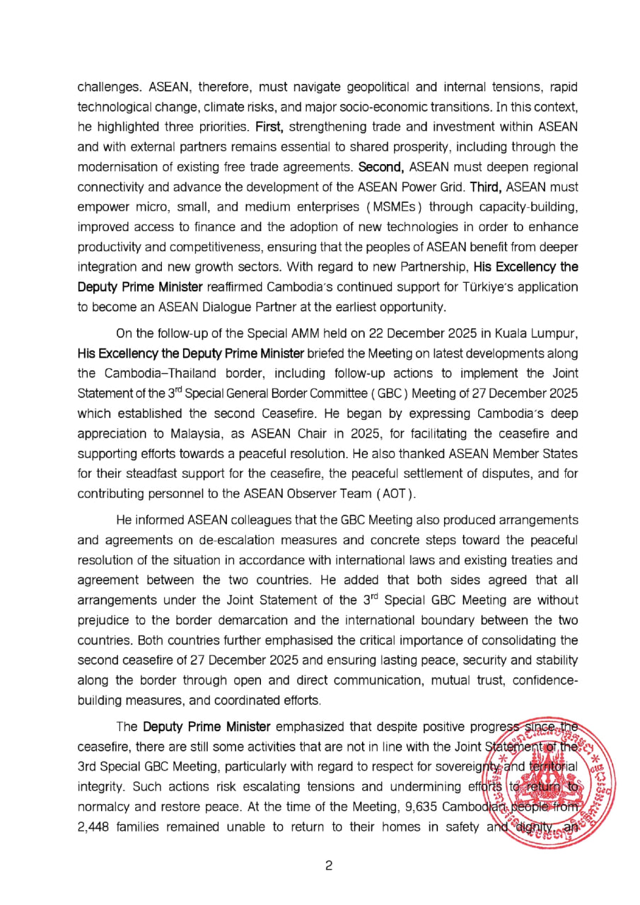 លោកឧបនាយករដ្ឋមន្ត្រី បានជម្រាបជូនកិច្ចប្រជុំ ពីការវិវត្តថ្មីៗតាមបណ្តោយព្រំដែនកម្ពុជា-ថៃ រួមទាំងសកម្មភាពតាមដាននានាដើម្បីអនុវត្តសេចក្តីប្រកាស រួមនៃកិច្ចប្រជុំពិសេសលើកទី៣ របស់គណៈកម្មាធិការព្រំដែនទូទៅ (GBC) នៅថ្ងៃទី២៧ ខែធ្នូ ឆ្នាំ២០២៥ ដែលបានបង្កើតឱ្យមានបទឈប់បាញ់ជាលើកទីពីរ។