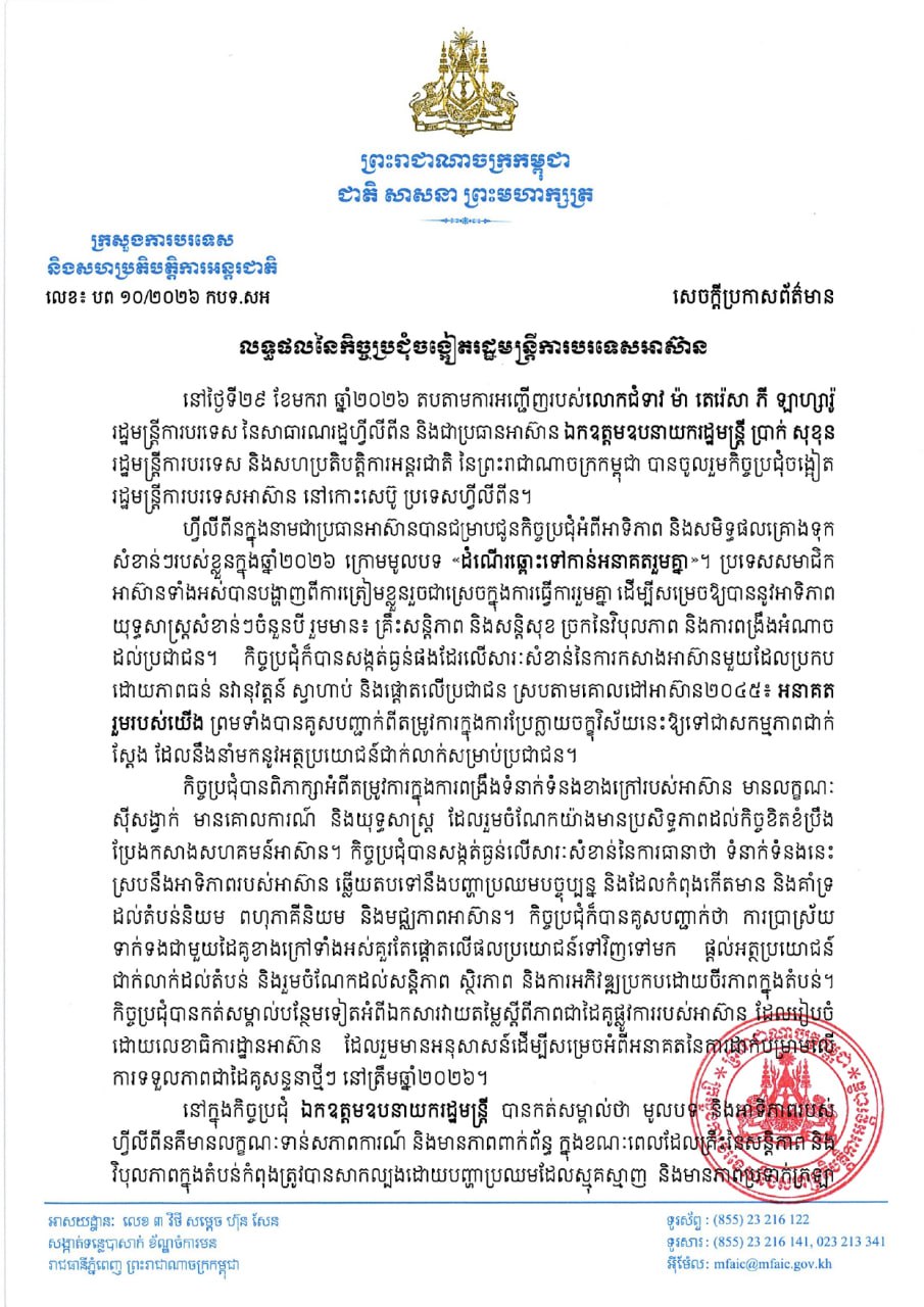 (ភ្នំពេញ)៖ ដើម្បី «ដំណើរឆ្ពោះទៅកាន់អនាគតរួមគ្នា», ប្រមុខការទូតកម្ពុជា លោកឧបនាយករដ្ឋមន្ត្រី ប្រាក់ សុខុន រដ្ឋមន្ត្រីក្រសួងការបរទេស និងសហប្រតិបត្តិការអន្តរជាតិ បានអំពាវនាវដល់អាស៊ាន បន្តគាំទ្រដំណោះស្រាយព្រំដែនកម្ពុជា និងថៃ តាមយន្តការដែលមានស្រាប់ និងស្របតាមច្បាប់អន្តរជាតិ។
