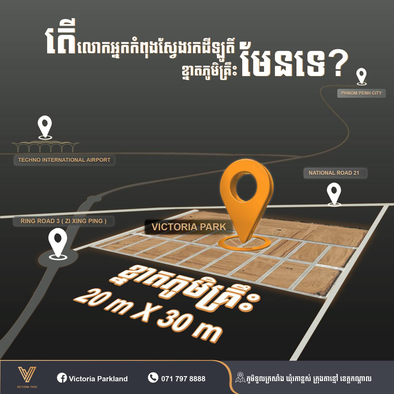 លោកបណ្ឌិតតេង រិទ្ធី អ្នកគ្រប់គ្រងគំរោងដីVictoria Parkបានមានប្រសាសន៍ឲ្យដឹងនៅដើមសប្តាហ៍នេះថា នៅពេលនិយាយពីការអភិវឌ្ឍ យើងនិយាយពីគុណតម្លៃ ទីតាំងសក្តានុពល និងកត្តាប្រជាសាស្រ្ត(ចំនួនប្រជាពលរដ្ឋ) និងគំរោងអភិវឌ្ឍន៍របស់រដ្ឋាភិបាលនៅជុំវិញ ព្រមទាំងការអភិវឌ្ឍរបស់វិស័យឯកជន។