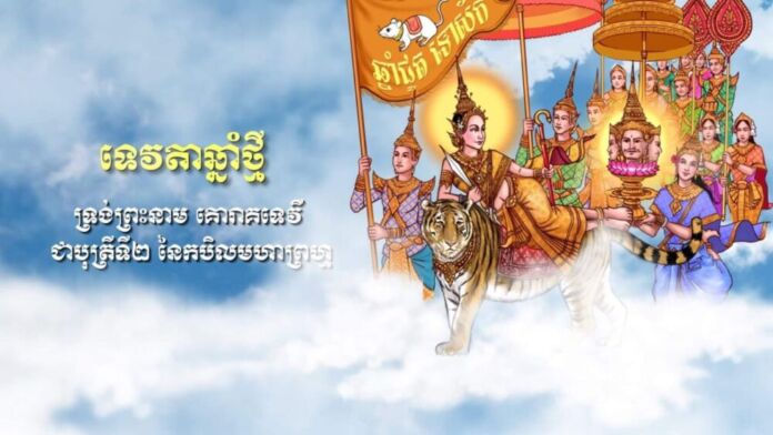 ទេវធីតាឆ្នាំថ្មី ព្រះនាម កិរិណីទេវី ជារាជបុត្រីទី៥ នៃកបិលមហាព្រហ្ម គង់នៅចាតុម្មហារាជិកា ទ្រង់អម្ពរពណ៌បៃតង លម្អនៅព្រះកាណ៌ដោយសៀតផ្កាមន្ទា អភរណៈកែវមរកត ភក្សាហារទ្រង់សណ្ដែកល្ង ព្រះហស្ដស្តាំទ្រង់កង្វេរ ព្រហស្តឆ្វេងទ្រង់កាំភ្លើង ទ្រង់គង់ឈរបើកព្រះនេត្រនៅលើខ្នងដំរី (គជសារ) ជាយានពាហនៈ។